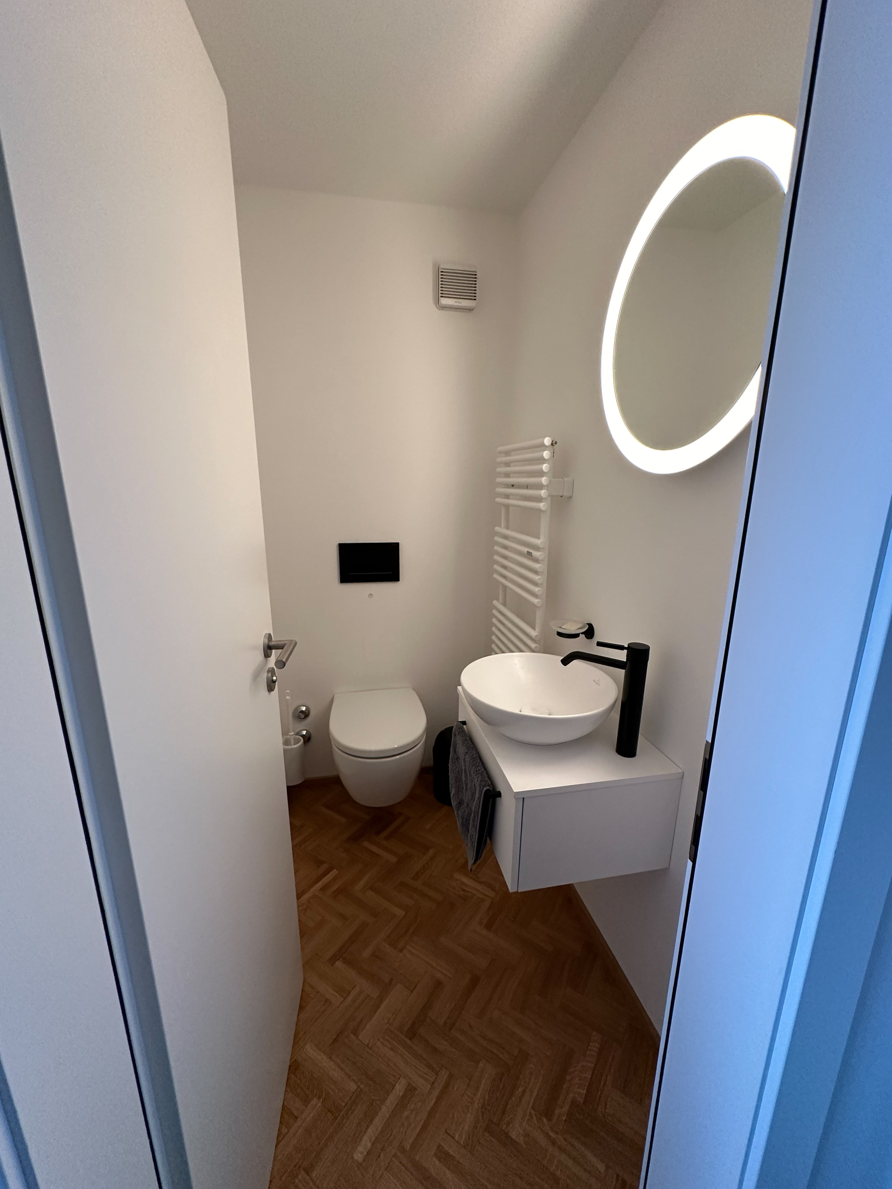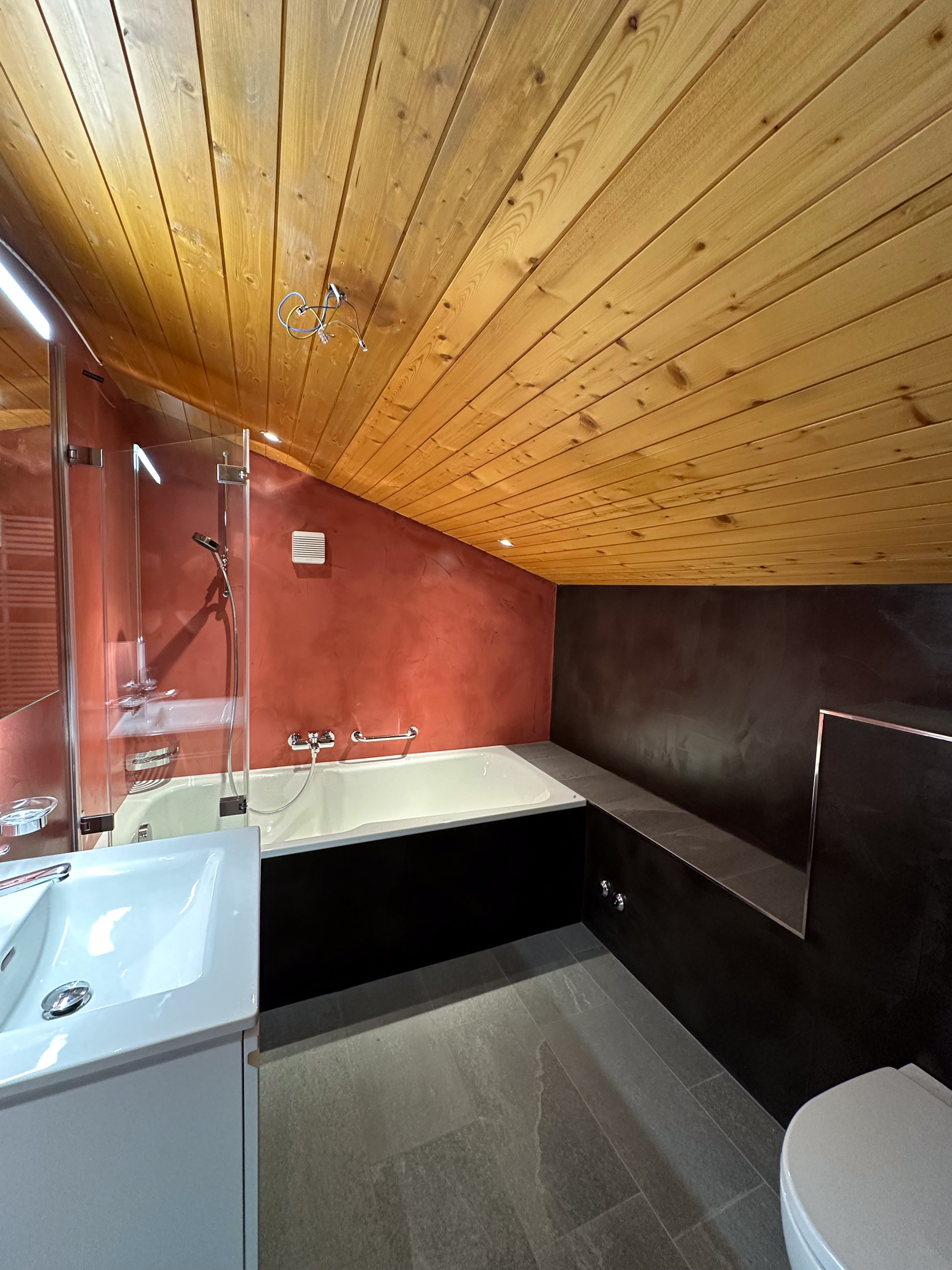 Eine Holztreppe führt in den oberen Bereich zu zwei Schlafzimmern und zwei Bädern. Das erste Schlafzimmer hat ein Doppelbett (180 cm breit) mit einem großen Kleiderschrank und einer Kommode. Das andere Schlafzimmer hat ein Doppelbett (140 cm breit), ein Etagenbett (90 cm breit), eine Kommode und einen Schreibtisch (ideal für Home-Office). Ein Badezimmer verfügt über ein Waschbecken und eine Dusche, das andere über eine Badewanne, ein Waschbecken und eine Toilette.