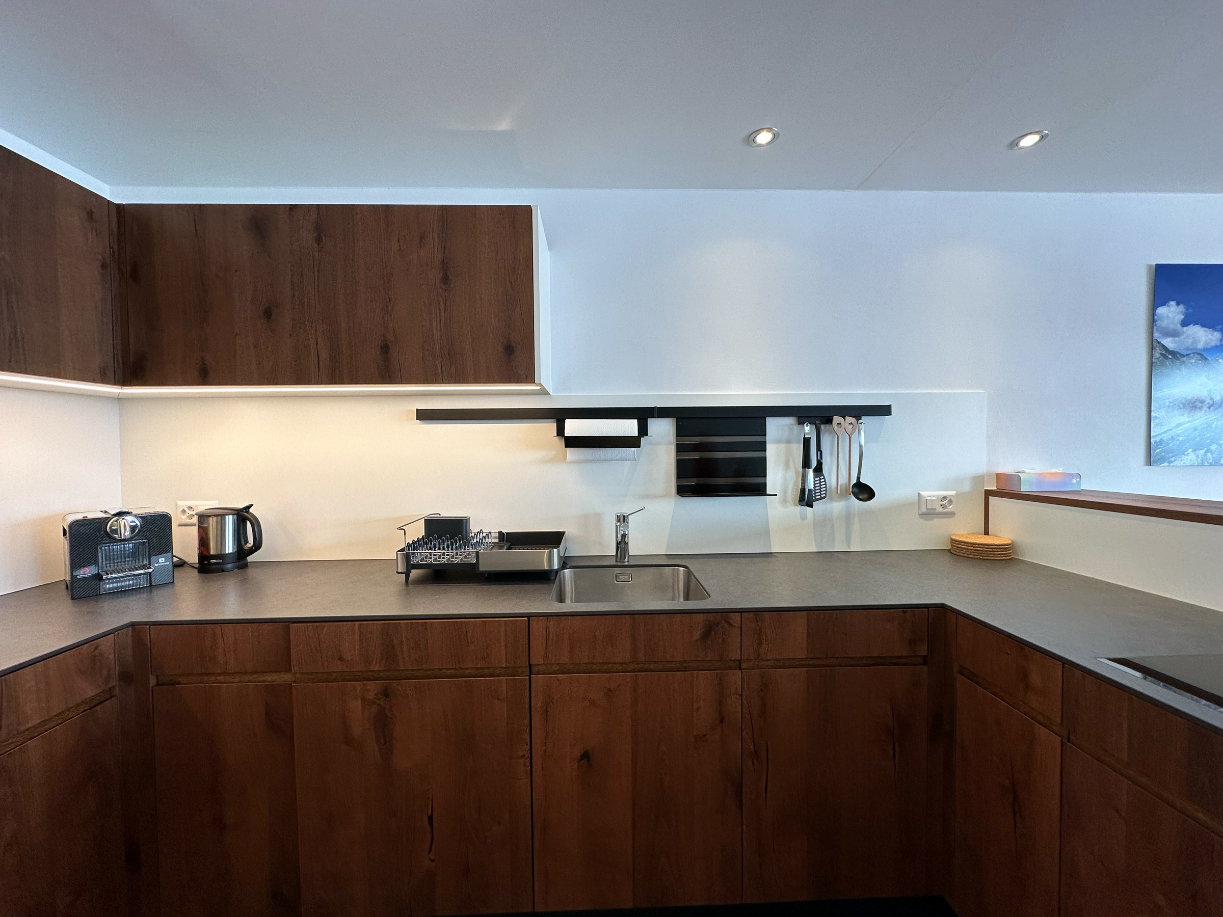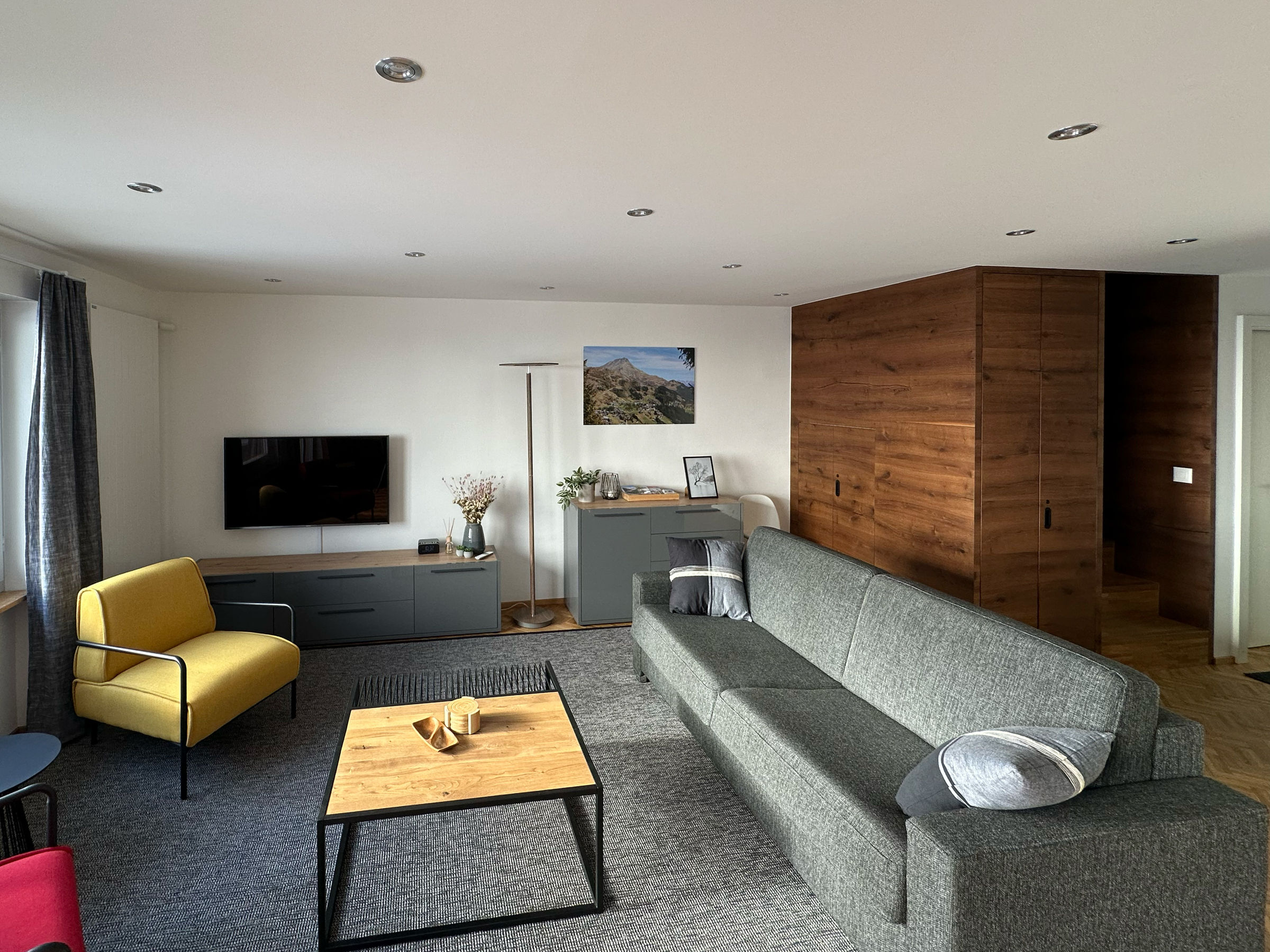 Der untere Bereich verfügt über eine offene Garderobe und ein Tages-WC gleich beim Eingang. Weiter geht es in einen großen offenen Wohn-, Ess- und Küchenbereich. Der Wohnbereich ist mit einem Sofa, zwei Sesseln und einem Fernseher möbliert. Die Küche ist voll ausgestattet mit modernen Geräten: Induktionskochfeld, Geschirrspüler, großer Kühlschrank mit Gefrierfach, Backofen und Mikrowelle-Gerät.